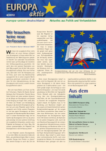 Die neue Ausgabe unserer Mitgliederzeitschrift ist da. In Europa aktiv 4-2012 lesen Sie u.a. Kommentare von EUD-Präsident Rainer Wieland zur Debatte um ein neues Grundgesetz sowie von Generalsekretär Christian Moos zur Diskussion um ein Euro-Parlament. Außerdem finden Sie dort einen Beitrag zu 60 Jahren Europäischer Wettbewerb, einen Bericht zur Wahl des neuen Präsidenten der Europäischen Bewegung sowie viele weitere Kommentare, Beiträge und Berichte aus den Landes-, Kreis-, Stadt- und Ortsverbänden der Europa-Union Deutschland. » weiterlesen