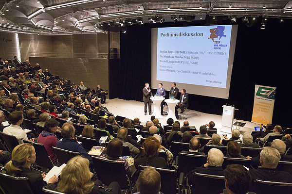 In einer kurzen Diskussionsrunde stellten gewählte Volksvertreter ihre Position zu TTIP dar. Der sozialdemokratische Europaabgeordnete Bernd Lange, Vorsitzender des Handelsausschusses und Berichterstatter für TTIP, nannte konkrete Beispiele, in denen Firmen aus der Region Mehrkosten entstünden, weil sie beim Export in die USA andere technische Normen beachten oder eine zweite Zertifizierung durchlaufen müssten. Trotz dieser Gründe für ein Freihandelsabkommen mit den USA sei es ihm aber wichtig, dass Regeln einführt würden, die das Wohlbefinden aller und nicht die Interessen einzelner förderten. Der CDU-Bundestagsabgeordnete Matthias Heider verwies darauf, dass Deutschland als exportorientierte Nation großes Interesse an einem Freihandelsabkommen mit den USA habe. „Der Impuls, den Freihandelsabkommen geben können, der ist aus der Geschichte unbestritten. Es gibt viele Abkommen, die eine positive Wirkung auf den Handel gehabt haben“, erinnerte Heider. Diesen Effekt würde man sich auch von einem Freihandelsabkommen zwischen den beiden größten Binnenmärkten erhoffen – der EU und den USA. Der Landtagsabgeordnete von Bündnis 90/Die Grünen Stefan Engstfeld möchte das TTIP-Abkommen nicht um jeden Preis. Handel sei zwar gut für die Belebung der Wirtschaft. Es müsse aber auch klare Grenzen und Regeln geben. Er habe kein Problem damit, wenn es darum ginge, technische Standards anzugleichen. Ein Freihandelsabkommen müsse aber „klare soziale und ökologische Leitplanken“ haben, so Engstfeld.