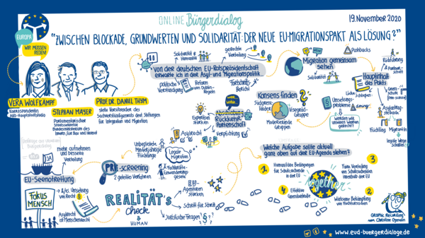 Nach Jahren der gegenseiteigen Blockade und des Streits soll ein neuer Asyl- und Migrationspakt die Europäische Union aus der politischen Sackgasse führen. Doch was beinhaltet der von der EU-Kommission vorgeschlagene Pakt genau? Kann es unter der deutschen EU-Ratspräsidentschaft noch gelingen, wichtige Kompromisse zwischen den Mitgliedsstaaten zu verhandeln? Wie kann ein Neustart in der europäischen Asyl- und Migrationspolitik gestaltet werden, ohne dabei fundamentale Grundwerte und Menschenrechte auszubooten? Sind die Mitgliedstaaten bereit, ihrer europäischen Solidarität und humanitären Verantwortung Rechnung zu tragen? Diese und andere Fragen wurden beim Bürgerdialog "Zwischen Blockgrade, Grundwerten und Solidarität: Der neue EU-Migrationspakt als Lösung?" gemeinsam mit Stephan Mayer, Parlamentarischer Staatssekretär im Bundesministerium des Innern, für Bau und Heimat, sowie Prof. Daniel Thym, stellvertretender Vorsitzender des Sachverständigenrats deutscher Stiftungen für Integration und Migration, diskutiert.