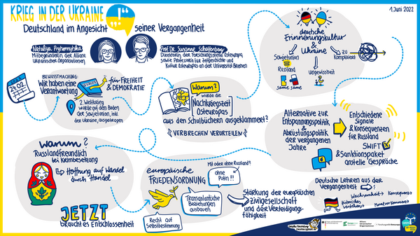 Bei der zweiten Veranstaltung des Bürgerdialogprojekts "Krieg in der Ukraine: Bürgerdialoge zur Zukunft der EU" diskutierten Nataliya Pryhornytska, Mitbegründerin der Allianz Ukrainischer Organisationen, sowie Prof. Dr. Susanne Schattenberg, Direktorin der Forschungsstelle Osteuropa und Professorin für Zeitgeschichte und Kultur Osteuropas an der Universität Bremen, mit den Bürgerinnen und Bürgern über den russischen Angriffskrieg in der Ukraine und dessen geschichtliche wie politische Dimension für Deutschland.