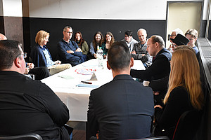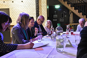Zum Abschluss des Bürgerdialogs stellten die fünf Tischmoderator*innen – Martin Mödder, Andreas Christ, Carolin Mues, Matthias Meinert und Pia Wirtz, die Ergebnisse der Diskussionen an den fünf Tischen dem Publikum vor. Die Veranstaltung endete mit einem Empfang, bei dem die Teilnehmenden die Möglichkeit hatten, die Gespräche in einem informellen Rahmen fortzusetzen.