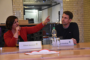 „Vom Deal zur Tat: Wie erreichen wir die Ziele des EU Green Deals in der Energiewende?“ – unter diesem Titel kamen die Diskussionsteilnehmenden am vierten Tisch mit Özlem Demirel, Mitglied des Europäischen Parlaments für DIE LINKE, und Florin Vondung, Senior Researcher für Energie-, Verkehrs- und Klimapolitik am Wuppertal Institut, ins Gespräch. Debattiert wurde an diesem Tisch unter anderem, ob Kernenergie von der EU als klimaneutrale Energiequelle eingestuft werden sollte. Darüber hinaus ging es um die Integration des Strommarktes in der EU, die Zusammensetzung der Energiepreise sowie EU-Förderungen für die Entwicklung von Speichertechnologien.