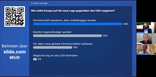 Sehr stimmig plädierten Strack-Zimmermann und Hofreiter für einen stärkeren Zusammenhalt der EU, gemeinsame Verteidigungsprojekte und den Aufbau neuer globaler Partnerschaften. Dabei dürfe man jedoch nicht die Beziehung mit den USA vergessen, denn es sei kein gänzlicher Bruch in unseren transatlantischen Beziehungen, sondern ein tiefer Vertrauensbruch.