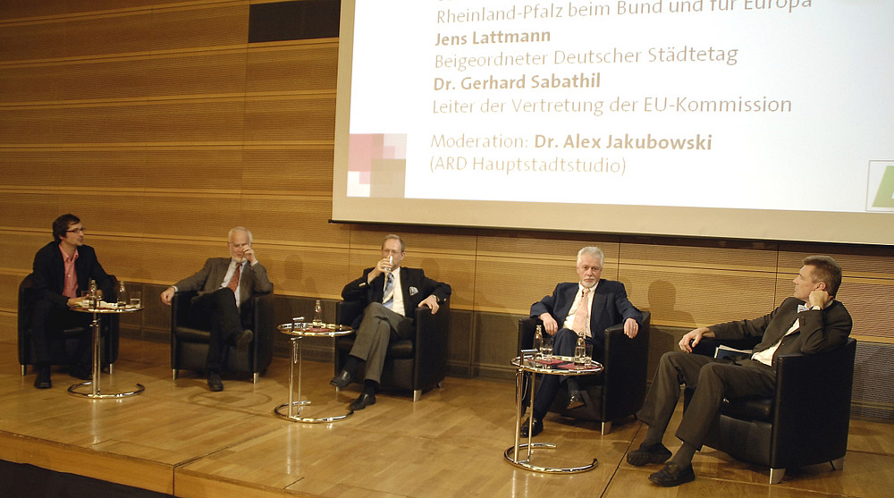 Im Anschluss an die Impulsreferate moderierte Dr. Alex Jakubowski (1.v.l.) vom ARD-Hauptstadtstudio ein Streitgespräch zwischen Wolf-Michael Catenhusen (2.v.l., Stellvertretender Vorsitzender des Normenkontrollrats) Dr. Karl-Heinz Klär (2.v.r., Bevollmächtigter des Landes Rheinland-Pfalz beim Bund und für Europa), Jens Lattmann (3.v.l.) Beigeordneter Deutscher Städtetag) und Dr. Gerhard Sabathil (1.v.r., Leiter der Vertretung der Europäischen Kommission in Deutschland). Trotz durchaus konträrer Positionen konnten sich die Kontrahenten darauf verständigen, dass Bürokratieabbau die gemeinsame Aufgabe aller Ebenen sei. Das oftmals praktizierte Verschieben der Schuld auf eine über- oder untergeordnete nationale oder internationale Ebene biete keine Lösung und führe beim Bürger zu Unverständnis und einer Abkehr von Europa.