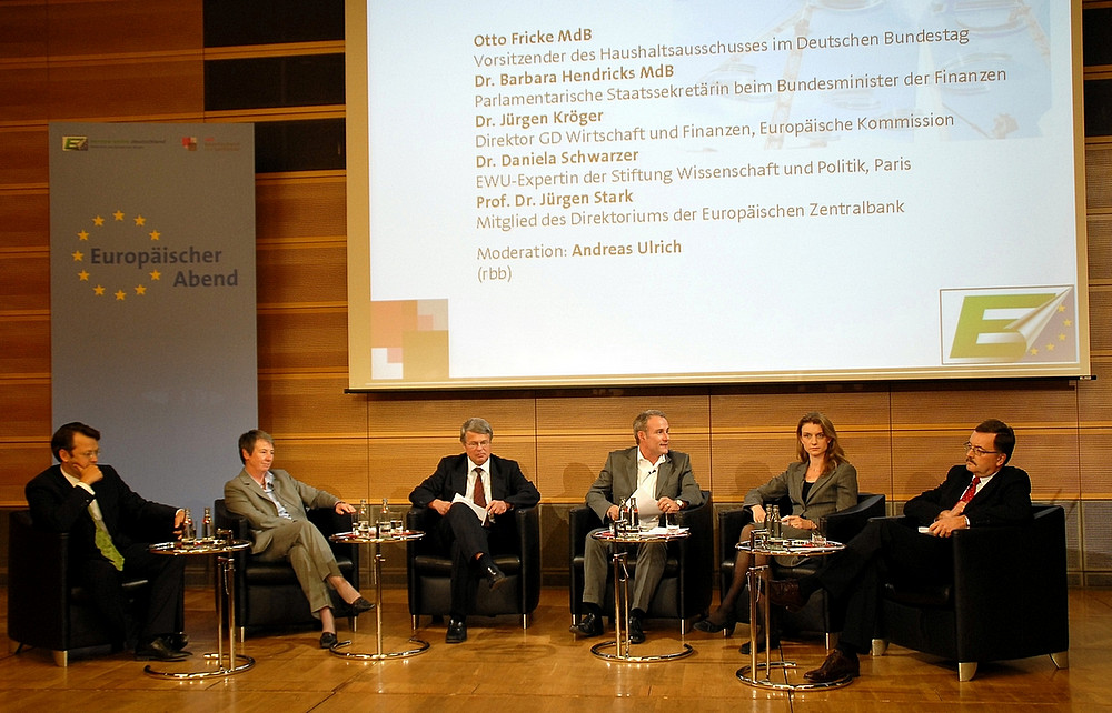 An dieser Forderung des Botschafters übte Prof. Jürgen Stark, Direktoriumsmitglied der Europäischen Zentralbank (EZB), in der anschließenden Podiumsdiskussion heftige Kritik. "Es gehört zu den Verpflichtungen (aus dem Stabilitäts- und Wachstumspakt) mit dazu, dass man zu diesen Verpflichtungen auch steht" sagte der EZB-Chefvolkswirt.