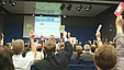 Auch das Publikum meldete sich zu Wort und diskutierte eifrig mit. Mehrere Zwischenrufe, spontaner Applaus und natürlich die Abstimmungen zeugten von einer emotionalen und hitzigen Debatte. Zum Schluss sollten die Duellanten ihre drei größten Wünsche für die Zukunft in einer Minute noch einmal auf den Punkt bringen. Herr Dr. Fischer wünschte sich, dass Esperanto in zehn Jahren auf freiwilliger Basis an Schulen und Universitäten angeboten werde, zudem solle man sich auch verstärkt für andere Sprachen jenseits der eigenen Grenzen interessieren, denn „andere Sprachen zu lernen ist wunderbar“. Herr Prof. Dr. Walter formulierte seine Wünsche folgendermaßen: „Lest Goethe, aber lest auch Mark Twain, damit ihr die Fülle der Sprache nicht vergesst“. Zudem wünsche er sich mehr Schüler- und Studierendenaustauch, denn nur so könne man andere Sprachen wirklich lernen und die dazugehörige Kultur verstehen. Herr Richter plädierte vor allem für einen Erhalt der Sprachenvielfalt und demnach eine funktionierende Mehrsprachigkeit. Reduzierung aus Effizienzgründen lehne er völlig ab. Ebenso unterstrich er die Wichtigkeit von verstärktem Austausch und vor allem der persönlichen Motivation.