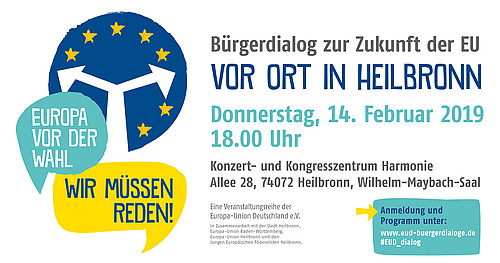 Am 14. Februar startet in Heilbronn die neue bundesweite Bürgerdialogreihe der überparteilichen Europa-Union Deutschland. Bei der Auftaktveranstaltung „Europa vor der Wahl – Wir müssen reden!“ um 18 Uhr in der „Harmonie“ kommt das Publikum mit Politikern und Experten persönlich ins Gespräch. Wie steht es um die Werte und den Zusammenhalt in der EU? Wie kommen europäische Regelungen zustande und welchen Mehrwert haben sie für die Menschen vor Ort? Und was erwarten sich die Heilbronnerinnen und Heilbronner von der Europawahl? Ziel des… » weiterlesen