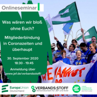 Europa-Union und JEF laden alle Ehrenamtlichen ein zur nächsten Verbands:stoff online Akademie „Was wären wir bloß ohne Euch? Mitgliederbindung in Coronazeiten und überhaupt“. Sie findet am Mittwoch,…