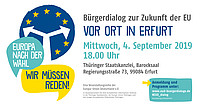 Am 4. September macht die bundesweite Bürgerdialogreihe der Europa-Union Deutschland „Europa nach der Wahl - Wir müssen reden!“ Station in Erfurt. Beim Bürgerdialog um 18 Uhr in der Staatskanzlei…