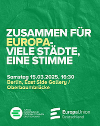 Am Samstag, 15. März 2025, finden in Berlin, Brüssel, Rom und weiteren Städten pro-europäische Kundgebungen statt. Unter dem Motto "Zusammen für Europa" soll ein Bekenntnis für ein Europa in Frieden…