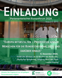Am 5. Dezember 2024 um 13 Uhr findet das Parlamentarische Europaforum der JEF Deutschland und der Europa-Union Parlamentariergruppe im Deutschen Bundestag statt. Unter dem Titel „Europa mitgestalten…