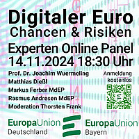 Am 14. November um 18:30 Uhr laden Europa-Union Bayern und Europa-Union Deutschland zu einer Online-Veranstaltung zum Digitalen Euro ein. Panel-Gäste sind Rasmus Andresen MdEP, Matthias Dießl,…