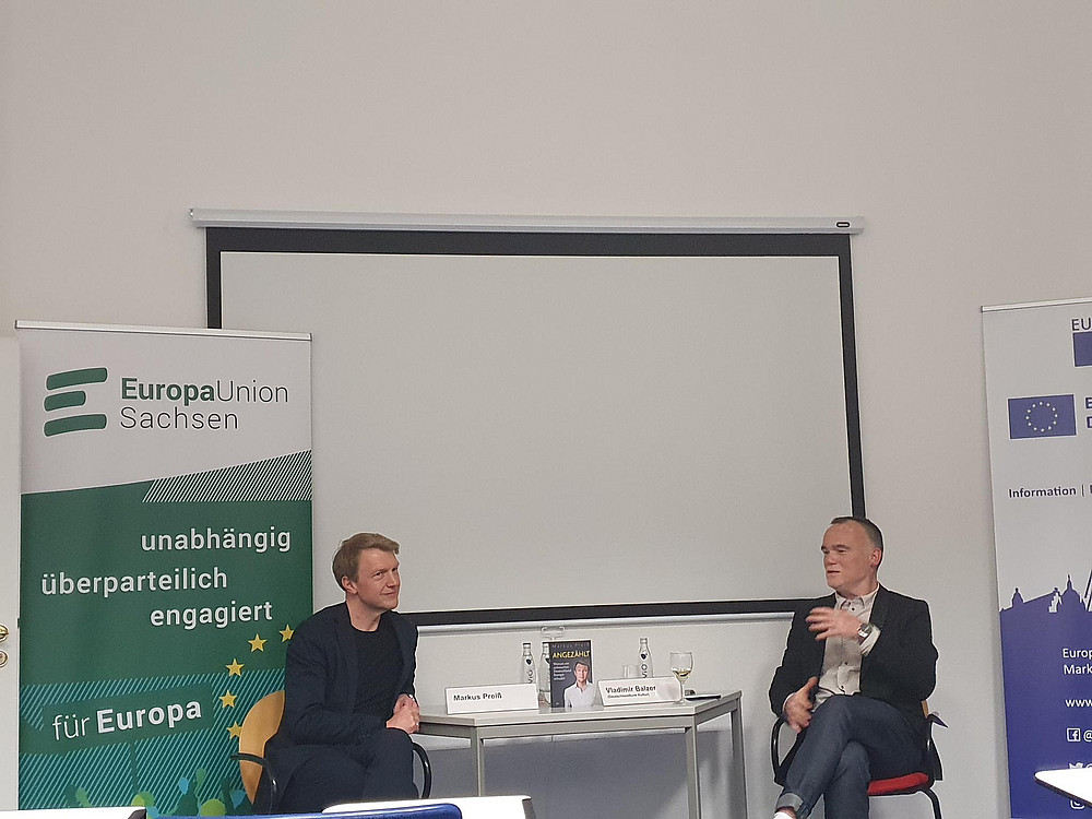 Anschließend war außerdem die Möglichkeit gegeben der Buchlesung des Autoren Markus Preiß aus seinem am 15. Februar erscheinenden Buch „Angezählt. Warum ein schwaches Deutschland Europa schadet“ mit anschließender Diskussion unter der Moderation von Vladimir Balzer beizuwohnen. Das Publikum war gefesselt und es blieb kein Stuhl leer. Neben Einblick in das Buch erhielten die Zuhörer:innen auch einen tiefen Einblick in das Leben des Autors.