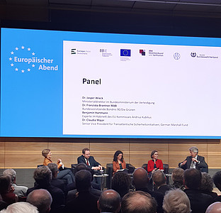 Im anschließenden Panel diskutierten die vorgenannten Redner*innen, mit Dr. Franziska Brantner MdB (Bundesvorsitzende Bündnis 90/ Die Grünen), Benjamin Hartmann (Experte im Kabinett des EU-Kommissars Andrius Kubilius), Dr. Claudia Major (Senior Vice President für Transatlantische Sicherheitsinitiativen des German Marshall Fund) unter der Moderation von Katharina Kühn (Freie Journalistin).