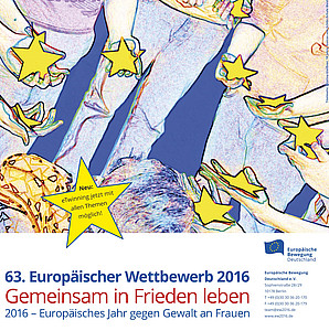 Der 63. Europäische Wettbewerb 2016 greift dieses Anliegen der EU auf, erweitert aber den Rahmen und fragt, wie typische Konflikte friedlich gelöst werden können. In 13 altersgerechten Aufgabenstellungen sind Schülerinnen und Schüler aller Jahrgänge und Schulformen aufgefordert, sich unter dem Motto "Gemeinsam in Frieden leben!" mit europäischen Werten wie Vielfalt, Gleichberechtigung und Zivilcourage auseinanderzusetzen. Mehr