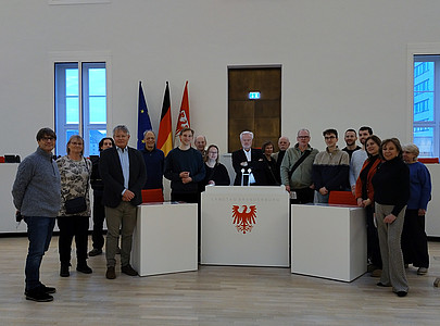Während der Führung erhielten die Teilnehmenden anschauliche Einblicke in Geschichte und Architektur des Parlamentsgebäudes sowie in die Arbeitsweise des Landtags. Im Austausch mit Julia Sahi standen aktuelle politische Entwicklungen im Land Brandenburg im Mittelpunkt. Diskutiert wurden unter anderem Fragen zum Landeshaushalt, zu den laufenden Koalitionsverhandlungen sowie zu sozialen Themen. Auch Aspekte der Europakommunikation, etwa im Zusammenhang mit Grenzkontrollen, wurden aufgegriffen. Die Runde nutzte die Gelegenheit für zahlreiche Nachfragen und eine vertiefte Diskussion.