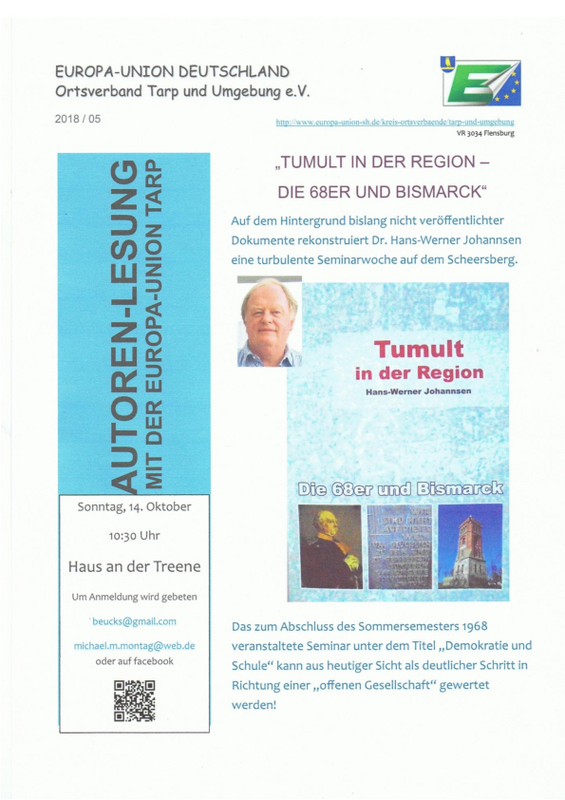 Der Ortsverband Tarp lädt herzlich zur Autoren-Lesung "Tumult in der Region - Die 68er und Bismarck" mit Hans-Werner Johannsen ein. Um eine Anmeldung wird gebeten, diese finden Sie hier.