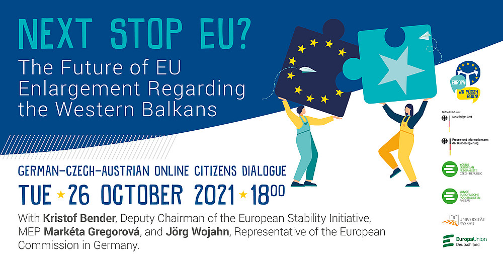Wir laden Sie am Dienstag, den 26. Oktober 2021, von 18:00-19:30 Uhr herzlich ein zu unserem deutsch-tschechisch-österreichischen Online-Bürgerdialog „Next Stop EU? The Future of EU Enlargement Regarding the Western Balkans“. Bereiten Sie sich inhaltlich in Kleingruppen vor und bringen Sie Ihre Anliegen und Fragen live auf Englisch in den virtuellen Dialog ein. Diskutieren Sie mit: