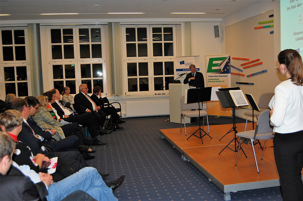 Am Dienstag, den 30. Oktober 2018 fand im Landeshaus in Kiel der Länderabend Österreich statt. Der Landtagspräsident Klaus Schlie und Niklas Sievers als Präsident der Europäischen Bewegung Schleswig-Holstein begrüßten die Gäste. Anlässlich der österreichischen EU-Ratspräsidentschaft war der Gesandte Andreas Somogyi nach Kiel gekommen, um über die Schwerpunkte und bisherigen Erfolge der Ratspräsidentschaft zu berichten. Im anschließenden Gespräch mit den Gästen zeigten sich die politischen Schwerpunkte der österreichischen Regierung insbesondere im Bereich Migrationspolitik.