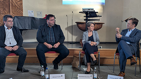 Moderiert von unserer Landesvorsitzenden Dr. Mechthild Baumann diskutierten zahlreiche Bürgerinnen und Bürger gemeinsam mit Andreas Pfeiffer, Bürgermeister von Senftenberg, Dr. Gunther Markwardt, Ökonom an der BTU Cottbus-Senftenberg, und Michael Franke, Regionalmanager der LAG „Energieregion im Lausitzer Seenland“, zum Strukturwandel in der Lausitz. Eingangs machte Pfeiffer in seinem Grußwort deutlich, dass durch die Transformation in der Lausitz zahlreiche Arbeitsplätze in zukunftsträchtigen Branchen u.a. rund um erneuerbare Energien entstünden. Allerdings sei es weiter notwendig, Verfahren und Vorschriften zu vereinfachen, um Regionen wie die Lausitz für Unternehmen noch attraktiver zu machen.