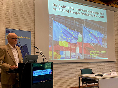 Im Austausch mit spannenden Referenten erfuhren die Teilnehmenden in der Europäischen Akademie SH in Sankelmark einiges über die Strukturen von EU und NATO, über Cybersicherheit, über Projekte für mehr Nachhaltigkeit in der Bundeswehr, über den Zustand der Marine und auch darüber, welche praktischen Herausforderungen eine engere Zusammenarbeit der europäischen Armeen mit sich bringt. Zu den Highlights des Programms gehörten zweifellos die Drohnenshow auf dem Außengelände sowie die abschließende Exkursion zur Marineschule Mürwik. Trotz der großen Ernsthaftigkeit des Themas und der ein oder anderen pessimistischen Äußerung zur europäischen Verteidigungsfähigkeit, sind am Ende alle Teilnehmerinnen und Teilnehmer von dem Seminar begeistert gewesen und konnten sicherlich viele neue Erkenntnisse mit nach Hause nehmen.