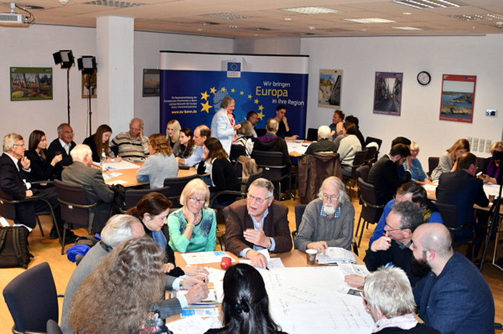 Die Stellvertretende Leiterin der Regionalvertretung, Judith Schilling, begrüßte die Teilnehmer und Teilnehmerinnen und nahm selbst aktiv an den Gruppen teil. Moderiert wurde die Veranstaltung von Dr. Sigrid Fretlöh, stellvertretende Vorsitzende der Europa-Union Bonn/Rhein-Sieg und Mitglied im Rednerpool Team Europe der Europäischen Kommission.