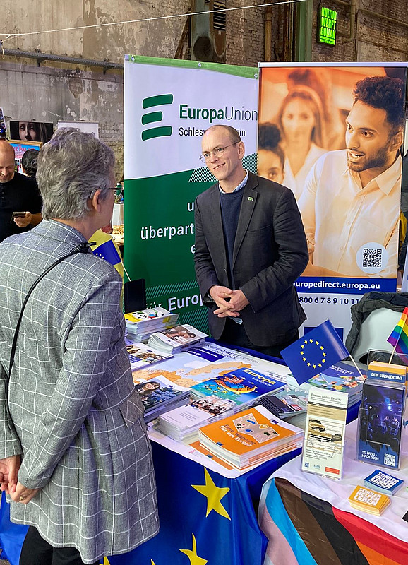 Der Stand von Europa-Union SH und Europäischer Bewegung SH war einer unter insgesamt mehr als 100, bei denen sich zahlreiche weitere Vereine und Verbände präsentierten. Es gab viele interessierte Nachfragen zu unserem Engagement und unseren Veranstaltungen im Land. Die Bedeutung und die Zukunft eines geeinten Europas Stand dabei angesichts der aktuellen Krisen im Mittepunkt. Auch Lübecks Bürgermeister Jan Lindenau war vor Ort und betonte die Bedeutung des Ehrenamtes für das Gemeinwesen.