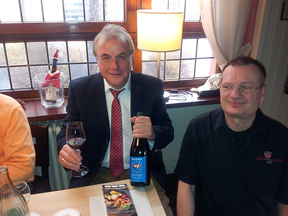 Weine aus den vier EU- Mitgliedsländern Rumänien, Bulgarien, Ungarn und Italien waren in Geisenheim zu einer besonderen Europa-Cuve´ zur Unterstützung des europäischen Gedankens kreiert worden. Er passte hervorragend zu dem als Verstärkung gereichten ungarischen Gulasch. So gestärkt, wurde an den festlich gedeckten Tischen bis weit in den Nachmittag hinein über Europa und die bevorstehende Eurropa-Wahl diskutiert.