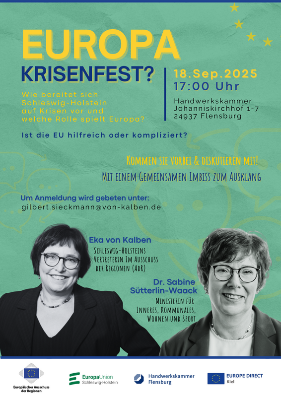 Gemeinsam mit Schleswig-Holsteins Innenministerin Dr. Sabine Sütterlin Waack und Eka von Kalben, Vertreterin Schleswig-Holsteins im Ausschuss der Regionen, wollen wir ins Gespräch kommen. Es geht um Resilienz, Sicherheit, Krisenfestigkeit und um die Rolle des europäischen Ausschusses der Regionen. Kommen Sie vorbei und diskutieren Sie mit!
