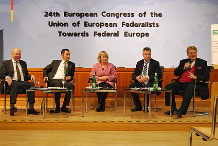 Neben den konstruktiven Debatten im Plenum des Kongresses gaben die Sitzungen der drei Political Committees der UEF zu den Themen Wirtschaftspolitik, Außenpolitik und Verbandsentwicklung die Möglichkeit, sich mit den aus ganz Europa angereisten UEF-Mitgliedern über die Fortentwicklung des Verbandes und die Perspektiven europäischer Politik auszutauschen. Anstoß für die Debatten gab eine Rede des deutschen Außenministers, Guido Westerwelle, am ersten Abend des Kongresses, in der er nicht nur sein europapolitisches Engagement Revue passieren ließ, sondern auch die kommenden Herausforderungen der EU im Inneren und in den Außenbeziehungen herausarbeitete. Ihm folgte eine von Andrew Duff (MdEP, ALDE) moderierte Podiumsdiskussion mit Elmar Brok (MdEP, CDU), Michael Link (MdB und Staatsminister im Auswärtigen Amt, FDP), Sylvia-Yvonne Kaufmann (SPD) und Cem Özdemir (MdB, Grüne), die sich mit den kommenden Europawahlen ebenso wie mit der kontroversen Frage direkt demokratischer Entscheidungen zu europäischen Themen befasste. Von Julian Plottka