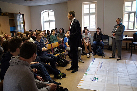 Viel Anklang fand die Bodenzeitung „Wortspiel“ der EUT. Landesvorsitzende Kalb zeigte den Schülern den Weg von der Gründung und Idee der EU bis zur Gegenwart.