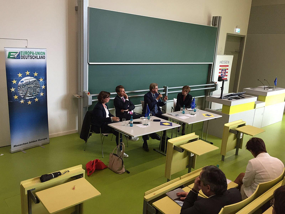 Im Hörsaal III der Universität Kassel sprechen wir gemeinsam mit der Europaministerin Lucia Puttrich über das Thema "Wohin steuert Europa? - Europäische Antworten und Perspektiven" und haben eine lebhafte, spannende Debatte. Auf dem Podium sind Martina Werner MdEP, der Vorsitzende der Deutsch-Französischen Gesellschaft Frankfurt, Christophe Braouet sowie unser EUH-Landesvorsitzender Thomas Mann MdEP. Sylvia Kuck von hr-iNFO sorgt für eine professionelle Moderation.