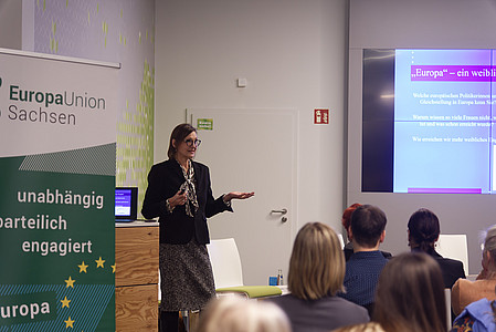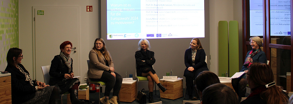 Die fünf Podiumsgäste diskutierten dann aus verschiedenen Perspektiven die Einleitungsfrage. Aus kommunaler Sicht führte Genka Lapön, Leiterin des Referats Gleichstellung der Stadt Leipzig, aus, sei die Gleichstellungspolitik der EU wichtiger Ideen- und Impulsgeber für ein gleichberechtigtes Wirken von Frauen in der Stadtgesellschaft. Erst die Frauen, so die Vorsitzende der Deutsch-Polnische Juristenvereinigung Prof. Dr. Ewa Tuora-Schwierskott, hätten den Regierungswechsel in Polen überhaupt möglich gemacht. Ihre Wahlbeteiligung lag mit 75 % deutlich über der der Männer. Wie wichtig die Vernetzung der Frauen auf europäischer Ebene ist, betonte Sophie Seyfert, stellvertretende Bundesvorsitzende der Deutschen Sektion der Europäische Frauen Union. Denn Frauen wählen Werte, wie Bildung, offene Grenzen und Lösungen für globale Herausforderungen. Emely-Marie Schäfer, Vorsitzende der JEF Sachsen, appellierte an Frauen wählen zu gehen, „weil wir wählen dürfen!“ Vor gar nicht langer Zeit hätten sich Frauen erst das Wahlrecht erstritten. Zudem warb sie dafür, jungen Menschen und jungen Frauen nicht nur eine Stimme, sondern auch Gestaltungsmöglichkeiten in der Politik zu geben.