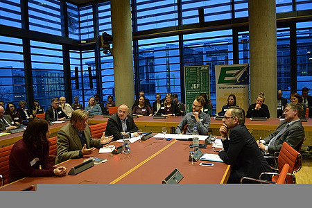 Den Abend eröffnete Josip Juratovic, stellvertretender Vorsitzender der Parlamentariergruppe der Europa-Union Deutschland. Gemeinsam mit Michael Roth, Staatsminister im Auswärtigen Amt für Europa, Tobias Flessenkemper von der Südosteuropa-Gesellschaft e.V. und dem Journalisten und Balkankenner Norbert Mappes-Niediek stand er dem Publikum als Gesprächspartner zur Verfügung. Die Diskussion im Fishbowl-Format, bei der jeweils zwei Plätze in der Gesprächsrunde von wechselnden Gästen aus dem Publikum eingenommen werden, moderierte JEF-Bundessekretär Vincent Venus.