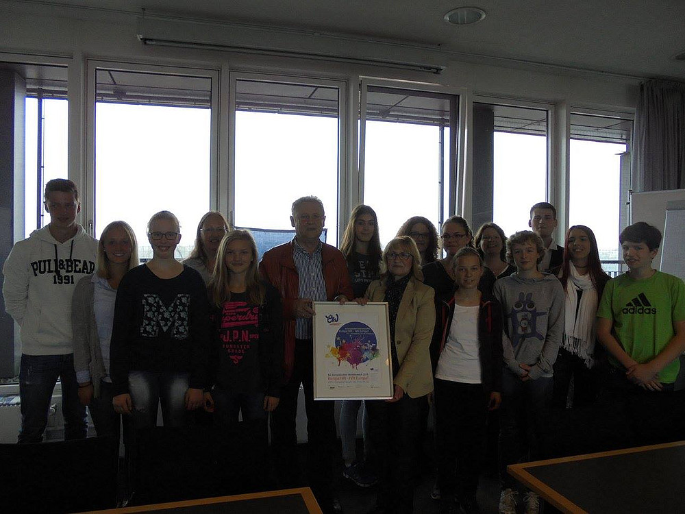 Am 22. September 2015 erhielten die Schülerinnen und Schüler aus den Händen der Flensburger Stadtpräsidentin Swetlana Krätzschmar und den beiden Vorstandsmitgliedern der Europa Union Deutschland Kreisverband Flensburg, Frau Buhl und Herrn Winkelmann, eine Urkunde und eine entsprechende Auszeichnung. Lina Klingsporn und Arlene Scheel aus der 7. Klassenstufe wurden für ihr Tagebuch „Bildung für alle“ ausgezeichnet. Kaja Battiston und Christopher Langrzik haben sich in einem Comic mit dem Thema „Festung Europa“ auseinandergesetzt und dafür den Europapreis bekommen.