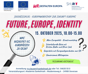 Future, Europe, Identity am 15. Oktober 2025 von 10:00 – 15:00 Uhr im Akademiezentrum Sankelmark, Akademieweg 6, 24988 Oeversee. Seid dabei und gestaltet Europas Zukunft mit!