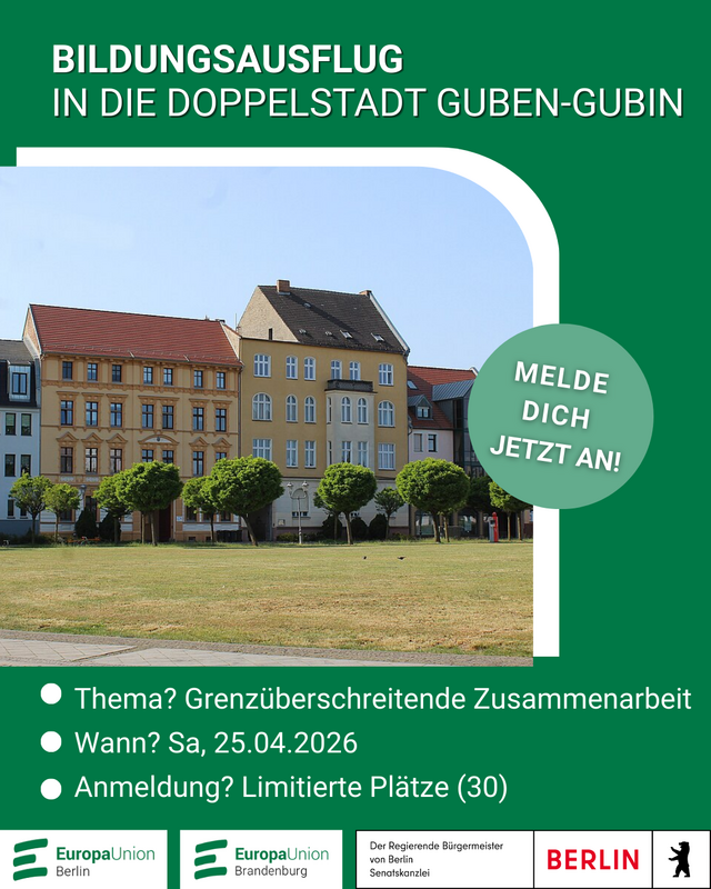 Gemeinsam mit der Europa-Union Berlin e.V. haben wir ein Programm (12-16 Uhr) zusammengestellt, das u.a. Gespräche mit der Euroregion Spree-Neiße-Bober e.V. und dem gemeinsamen deutsch-polnischen Polizeiteam und einen Spaziergang durch die Doppelstadt vorsieht. Den Abschluss bildet ein Gespräch mit dem Bürgermeister von Guben Fred Mahro.