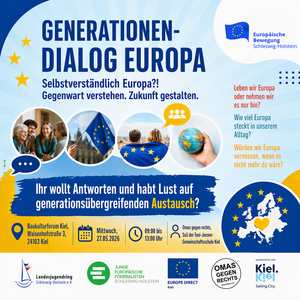 Beim Generationen-Dialog der Europäischen Bewegung Schleswig-Holstein kommen Menschen unterschiedlicher Altersgruppen miteinander ins Gespräch: Senior*innen, die Europa über Jahrzehnte erlebt und mitgestaltet haben, treffen auf junge Menschen, die mit offenen Grenzen und neuen Herausforderungen aufwachsen, darunter Schülerinnen und Schüler der Toni-Jensen-Gemeinschaftsschule in Kiel. In moderierten Dialogen, persönlichen Erzählungen und interaktiven Formaten werden Erfahrungen geteilt, Perspektiven ausgetauscht und gemeinsame Zukunftsvisionen entwickelt.