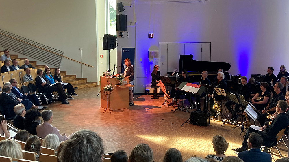 Die Big Band der Hochschule sorgte mit Livemusik von Beginn an für Stimmung unter den gut 250 Gästen, unter denen sich auch Landesbildungsministerin Karin Prien befand. In ihrem Grußwort hob sie vor allem die Kernkompetenz der EUF hervor: die Lehrkräftegewinnung. Diese sei die „größte bildungspolitische Herausforderung der kommenden Jahre“, so Prien. EUF-Präsident Reinhart nahm in seiner Rede Bezug auf die sieben Kardinaltugenden, zu denen bekanntermaßen auch die Gerechtigkeit gehört. In diesem Zusammenhang kritisierte Reinhart, die Unterfinanzierung der Uni als ungerecht, schlug aber bei den Tugenden Liebe und Hoffnung auch versönliche Töne an.