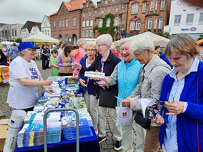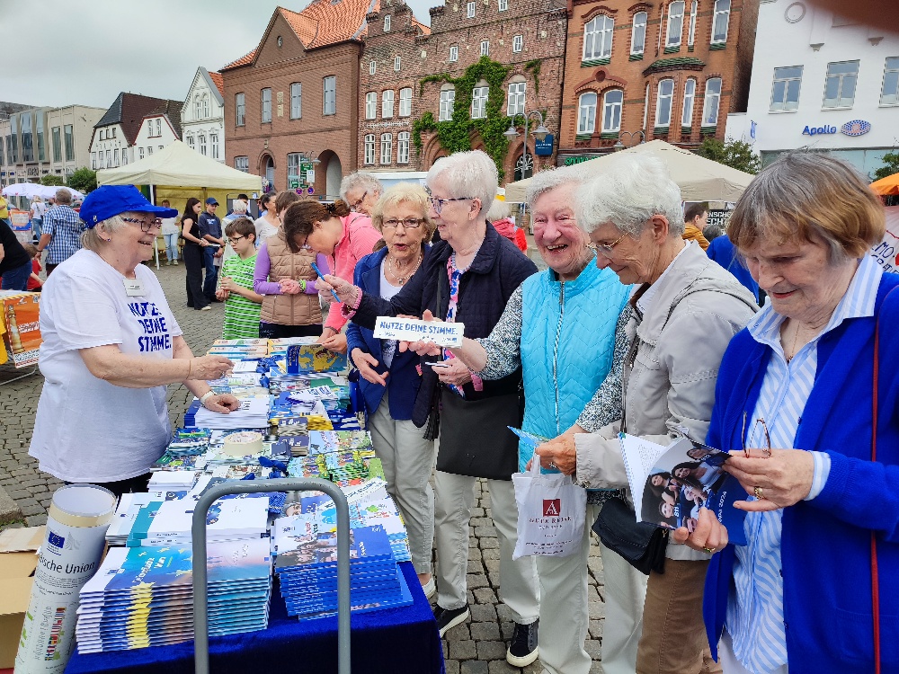 Politikprofis und ehrenamtlich Engagierte – gemeinsam haben Sie bei bestem Wetter auf dem Husumer Marktplatz für die Teilnahme an der Europawahl geworben. Neben der Europa-Union Nordfriesland waren auch weitere Verbände und Organisationen vor Ort, um mit den Bürgerinnen und Bürgern ins Gespräch zu kommen, sich über die Europäische Union auszutauschen und zur Teilnahme an der Europawahl aufzurufen.
