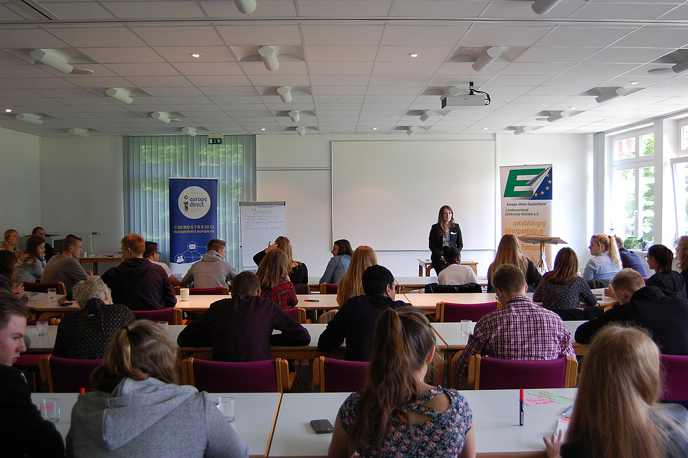 Zunächst lernten die Schüler*innen grundlegende Dinge über die EU, wobei viele von ihnen bereits Vorwissen zeigten. Im Anschluss bekamen sie einen Input zum Thema Moderation, welche anschließend in einer kurzen Diskussion geübt wurde. Nachdem sich die Schüler*innen danach in unterschiedliche Texte zur gemeinsamen Außen- und Sicherheitspoltik der EU, der Eurokrise und der Erweiterungspolitik einarbeiteten, folgte eine Mittagspause.