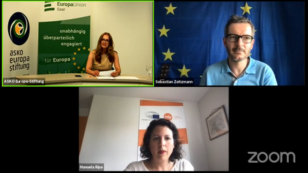 Am 18. Juni fand die vierte Ausgabe der Veranstaltungsreihe der Europa-Union Saar (EUS) "Online-Meeting mit Europa" statt. Zum Thema "Europa anders wählen - europäisch wählen! Warum wir ein echtes europäisches Wahlrecht mit transnationalen Listen brauchen!“ diskutierten die saarländische Europaabgeordnete Manuela Ripa und der Europajurist Sebastian Zeitzmann zusammen mit der Landesvorsitzenden der EUS, Margriet Zieder-Ripplinger. Wegen einer kurzfristigen terminlichen Verhinderung gab es von der Europaabgeordneten Katarina Barley eine kurze Videobotschaft.