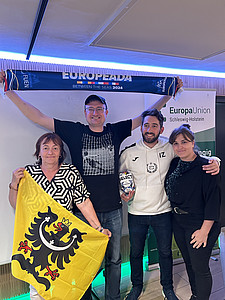 Der Quizabend zur EUROPEADA ist in Zusammenarbeit mit dem Minderheiten Kompetenzzentrum der Akademie, der Europa-Union Schleswig-Holstein, der Europäischen Bewegung Schleswig-Holstein dem Europe Direct Zentrum Kiel organisiert worden. Rund 70 Teilnehmerinnen und Teilnehmer aus den an der EUROPEADA beteiligten Minderheiten traten dabei in einem lebhaften Wissenswettbewerb gegeneinander an und lieferten sich ein spannendes Rennen. Und der Fragenkatalog hatte es in sich: Hätten Sie beispielsweise gewusst, seit wann Frauen offiziell an den Olympischen Spielen teilnehmen können (1900), wo das größte Fußball-Stadion Europas steht (Barcelona) oder welche beiden europäischen Länder die meisten Amtssprachen haben (Spanien und Schweiz)? Die meisten richtigen Antworten kamen an diesem Abend vom Team der Deutschen Minderheit in Tschechien, das sich in einem spannenden Kopf-an-Kopf-Rennen durchsetzen konnte (siehe Foto). Zu den Preisen für das Siegerteam gehörte unter anderem einer der offiziellen EUROPEADA-Turnierbälle.