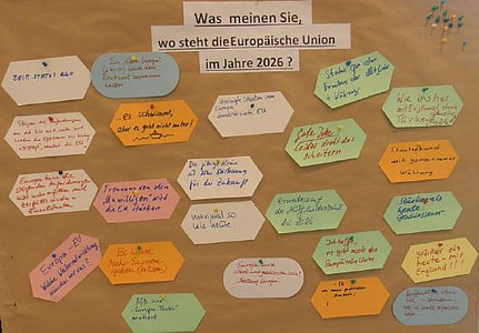 In einer Zukunftswerkstatt unter dem Motto „Ideen sind gefragt“ erarbeitete die Seminargruppe Lösungsvorschläge zu den Themen Flüchtlingsfrage, Finanzkrise und Entwicklung der EU. Die Zukunftswerkstatt wurde in der Form eines World-Cafés durchgeführt. Dabei wurden drei Thementische eingerichtet, an denen die Teilnehmer in mehreren Runden und wechselnden Konstellationen zusammenarbeiteten. Moderiert wurden die Runden an den Tischen von Christian Moos, Generalsekretär der Europa-Union Deutschland, zum Thema Finanzkrise, Vincent Venus, Bundessekretär der Jungen Europäischen Föderalisten, zum Thema Entwicklung der EU und Katharina Borngässer, stellvertretende Bundesvorsitzende der JEF, zum Thema Flüchtlingspolitik. Das Format der Zukunftswerkstatt lud zu Kreativität ein und kam bei den Teilnehmern sehr gut an. Im Nachgang wurden die Vorschläge von der Tagungsleitung aufbereitet und den Teilnehmerinnen und Teilnehmern, sowie den Veranstaltern übermittelt.