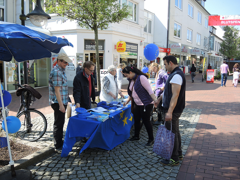 In Zusammenarbeit mit dem Kreisverband Schleswig-Flensburg baute der Ortsverband Schleswig der Europa- Union anlässlich der Europawoche Anfang Mai 2016 wieder seinen traditionellen Informationsstand in der Fußgängerzone in Schleswig auf. Neben Informationsbroschüren für Jugendliche und Erwachsene verteilten Mitglieder des Vorstandes auch Malbücher mit europäischer Themenstellung sowie blaue Luftballons mit Europasternen für Kinder.