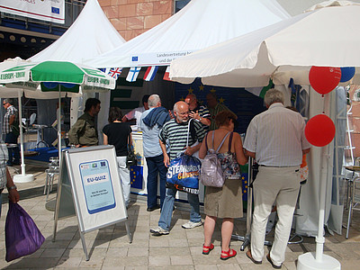 In einem Quiz können Erwachsene und Jugendliche zudem ihr Wissen zu Europa testen und werden mit attraktiven Sachpreisen belohnt. Eine Bodenzeitung gibt Ihnen die Möglichkeit, Ihre Meinung zur Arbeit des Europäischen Parlaments zu äußern.