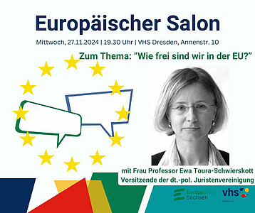 Am Mittwoch, den 27. November 2024 empfangen Katharina Wolf, Landesvorsitzende der Europa Union Sachsen und Jürgen Küfner, Direktor der VHS Dresden, die Vorsitzende der deutsch-polnischen Juristenvereinigung Frau Professor Ewa Toura-Schwierskott, beim Europäischen Salon.