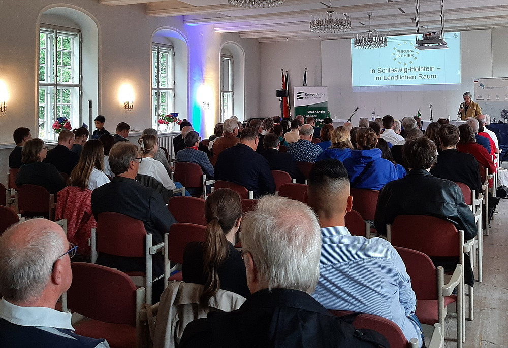 Doch nicht nur die Spitzenkandidaten Delara Burkhardt (SPD), Rasmus Andresen (Grüne), Niclas Herbst (CDU) und Helmer Krane (FDP) waren anwesend, auch die Staatssekretärin im Europaministerium, Anne Benett-Sturies, ist dabei gewesen. Zusammen mit der ALR-Vorsitzenden, Dr. Juliane Rumpf, sowie der Bad Bramstedter Bürgermeisterin, Verena Jeske, eröffnete sie das Event. Die anschließende Podiumsdiskussion wurde von Ralf Rose, Geschäftsführer der Europa-Union SH und Katharina Glockner, Sprecherin der Aktivregionen, geleitet. Das Publikum zeigte reges Interesse und stellte Nachfragen zu Themen wie dem öffentlichen Nahverkehr oder überfälligem Bürokratieabbau. Die Diskussion drehte sich natürlich auch um die anstehende Europawahl am 09. Juni 2024, die Zukunft der ländlichen Räume und dem drohenden Rechtsruck. Die Impulse durch das Publikum wurden durch das interaktive Tool MentiMeter gesetzt. Damit ist den Abgeordneten ein aktuelles Stimmungsbild verschafft worden, in dem die Meinungen der Zuhörer zu bestimmten europolitischen Themen an die Wand geworfen wurden.