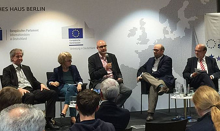 Das erste Panel, moderiert von Joachim Fritz-Vannahme, widmete sich der Frage, wie die Herausforderungen in den Bereichen Währungspolitik, Schengen und Sicherheit europäisch gelöst werden können. Auch die Ablehnung der EU durch einen Teil der Bevölkerung war Thema.