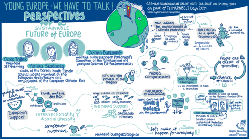 Die über 85 Teilnehmenden des deutsch-skandinavischen Jugenddialogs waren sich einig: Die EU muss klimaneutral werden. Dass die EU derzeit genug für den Klima- und Umweltschutz tue, davon waren aber nur 6 Prozent der jungen Europäerinnen und Europäer überzeugt. Doch wie kann die EU das für 2050 anvisierte Ziel der Klimaneutralität erreichen? Wie sieht ein klimagerechtes, gesellschaftlich und sozial nachhaltiges Europa aus? Was können junge Menschen gegen die Klimakrise tun?
